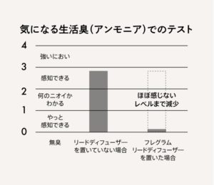 消臭効果の試験結果では、気になる生活臭(アンモニア)が30分程度でほぼ感じないレベルまで減少!いやなニオイを消しながら香りづけするので香りが混ざることを気にせずお部屋の香りを楽しんでいただけます。